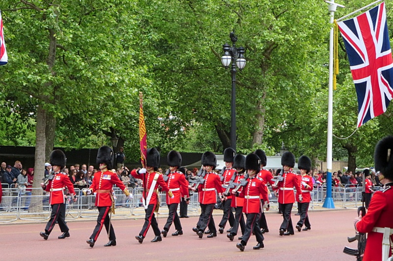 Initially, bands and soldiers march towards Horse Guards Parade along The Mall. They reached our position around 1015. They originated from the direction of Wellington Barracks.